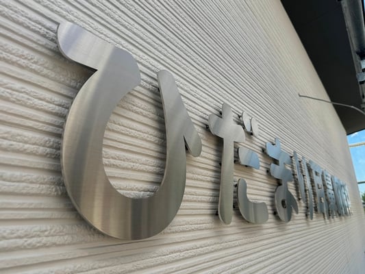 ステンレス切文字サインは壁面から20mmほど浮かしボルト出し取付。