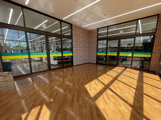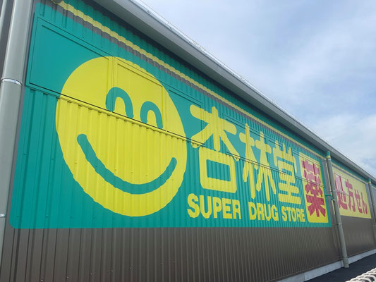 北側店舗表示サインは、角波鉄板の壁面に下地を塗装し、マークと文字はマーキングフィルムにて貼り仕上げ。