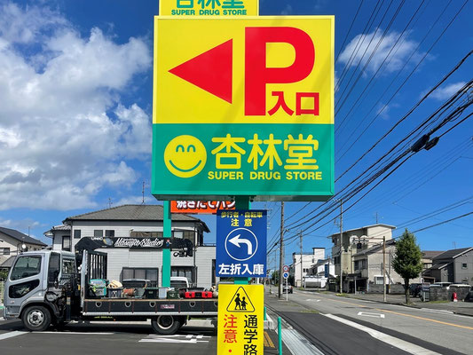 店舗名大型ポールサイン、誘導建植看板共に内部にLEDを組み込んだ鉄骨溶接塗装の本体と、表示面のFFシートにマーキングフィルムを貼った内照式看板。