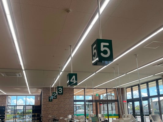 レジ番号案内吊りサインは、アクリル板で四角に組み立てたボックス内部にLED電球を取り付け、表面にマーキングフィルムを貼り、天井裏まで通した長尺ボルトをLアングルにて連結させ、ナット固定。